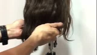 ブロッキングした下側の髪の毛を少量とり、顔側から「内→外→内→外」の順に巻いていきましょう。