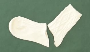 靴下をかかとのあたりで半分にカットしましょう。下の部分を帽子に、上の部分を身体に使います。