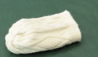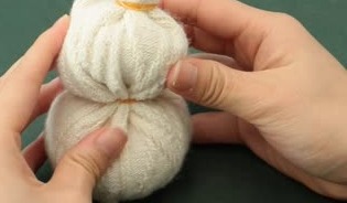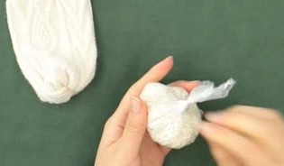 ビニール袋に入れた適量のお米を靴下の中に入れ、輪ゴムで結びましょう。