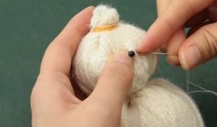 目にはビーズを、洋服にはボタンを縫い合わせ、飾りつけをします。