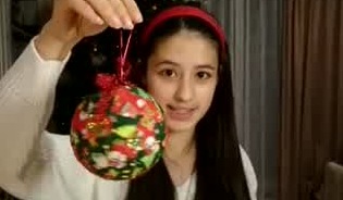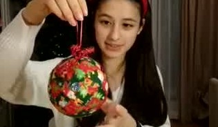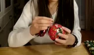 スパンコールをつけた虫ピンを数か所にさし、ボールをデコレーションしていきます。