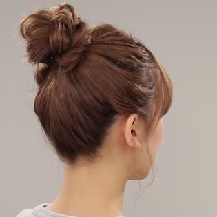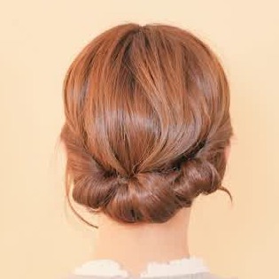 2段階目は左右の耳上辺りの髪をそれぞれ取り、ねじって1段階目の下辺りに同じく固定。全体をほぐしたら、完成です。