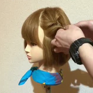 耳の上あたりの髪の毛を取り、くるりんぱをつくりましょう。この時、取った髪を全部をくるりんぱするのではなく、真ん中の髪を落として(イメージは、三つ編みするために3つに分けた髪の真ん中部分を捨てる感じで!)くるりんぱします。