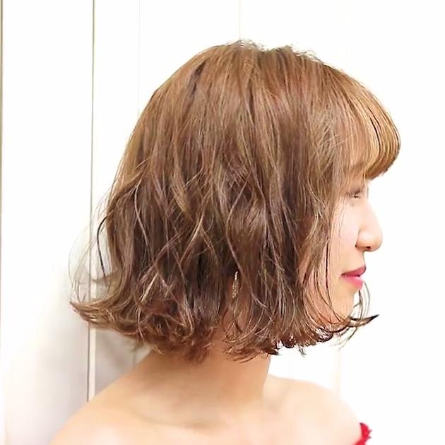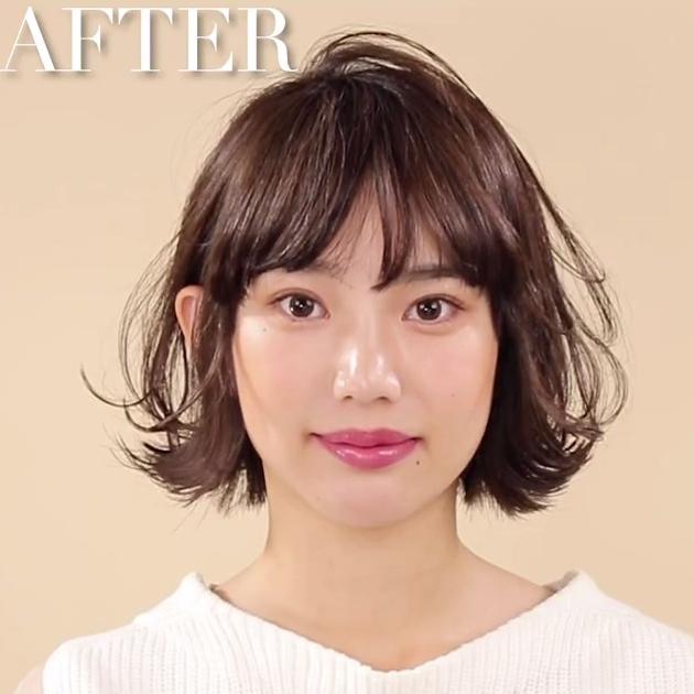 天使のバングを作ることで頬の膨らみをカバー。さらに、ふんわりとしたワンカールパーマで柔らかい印象にしてくれます。