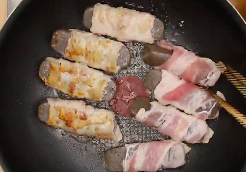 熱したフライパンに、巻き終わりを下にして肉巻きこんにゃくを敷き詰め、炒めていきます。