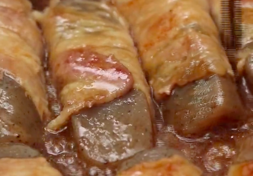 豚バラ肉の薄切り150gをまな板の上に乗せ、こんにゃくをくるくると巻いていきます。