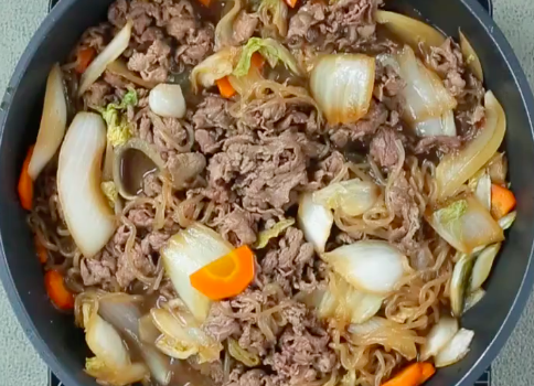 野菜がしんなりしてきたら、牛肉250gをフライパンに加えます。