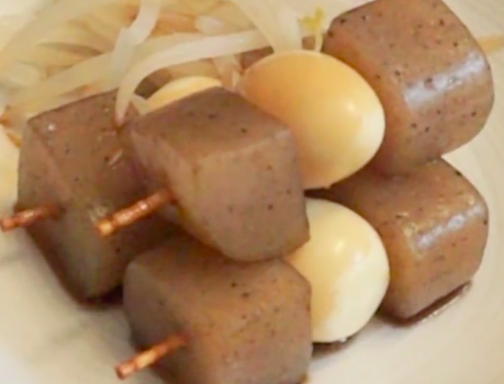 フライパンに、爪楊枝にさしたこんにゃくとうずらの卵を入れて、タレをよく絡めたら完成です。