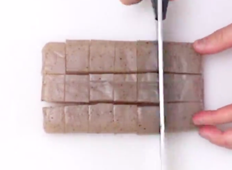 茹で上がったこんにゃくを、正方形にカットします。