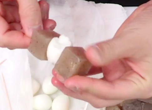 正方形にカットしたこんにゃくと、うずらの卵を爪楊枝にさしていきます。