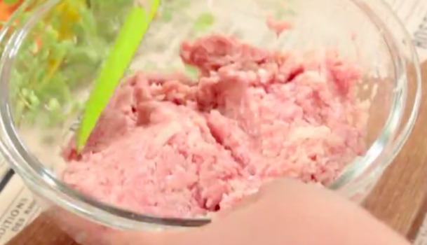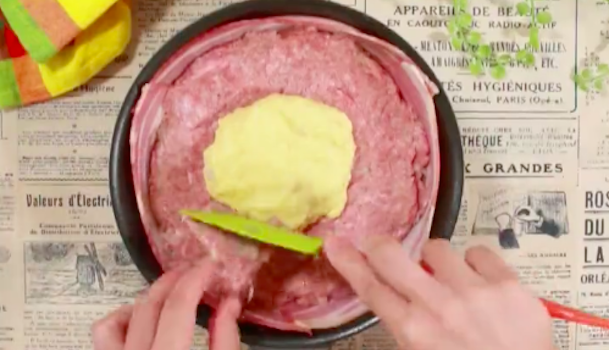 残りのハンバーグの種を、コンポタクリームを覆い隠すように上にかぶせていきましょう。