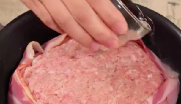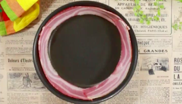 フライパンの側面にベーコン3枚を貼り付けます。