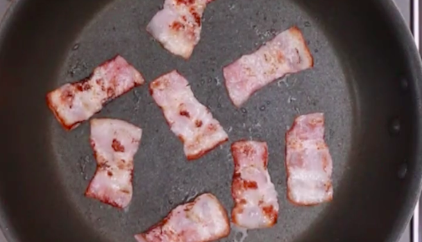 ベーコンを短冊切りにして、熱したフライパンでカリカリになるまで焼いたら、一度取り出します。