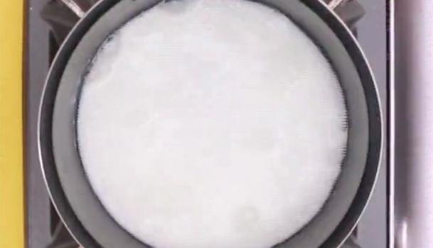 鍋に水100ccと牛乳1カップを入れて沸騰させます。吹きこぼれないように注意してください。