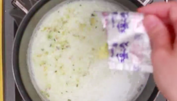 耐熱皿にコーンポタージュの素1袋、小麦粉大さじ1/2、牛乳100ccを入れて混ぜ、電磁レンジで2分温め、冷ましましょう。