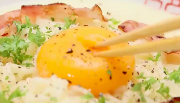器に盛り付けて汁を流し入れたら、真ん中に卵黄、周りにベーコンをのせます。上から粗挽き黒胡椒とパセリをかければ、完成です♪卵黄を崩して絡めて召し上がりください。
