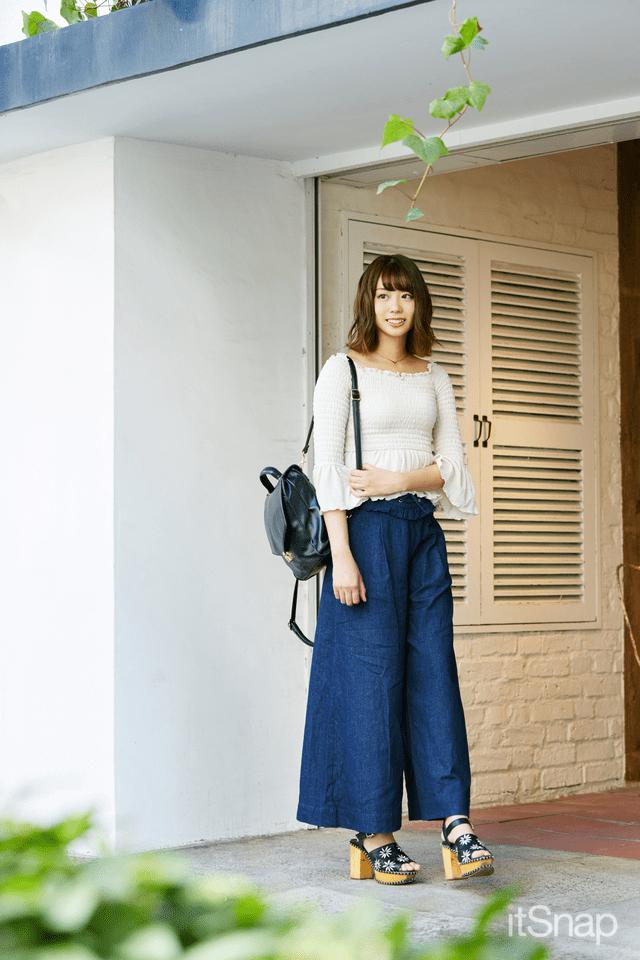 シーズン問わず人気のワイドパンツ。小さめリュックで上半身はコンパクトにすることでバランスもGOOD◎