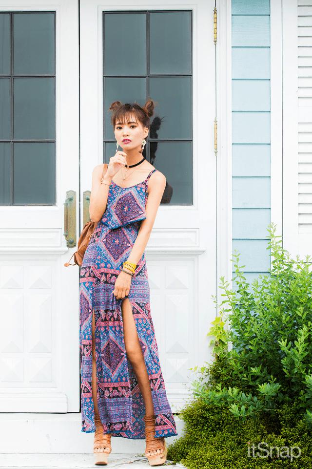 エスニック柄のセットアップはそれだけでインパクト大。ブラウンのリュックは洋服を邪魔せずに存在感を出せるアイテムです♪