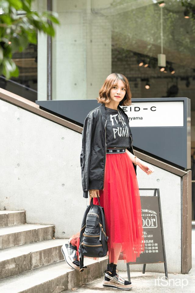着こなすのが難しそうなフレアのカラースカート。ライダースとリュックを合わせれば甘くなりすぎず、甘辛MIXコーデに大変身♡