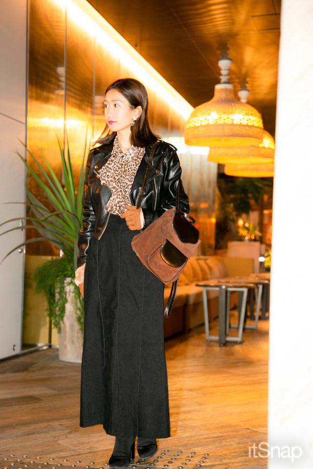 黒を基調としたコーデに少し個性的なブラウンのリュックでクールな大人かっこいいコーデ。ライダースはかわいくもかっこよくも着こなせる万能アイテムですね!