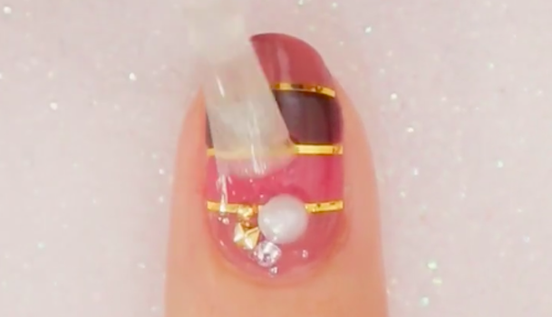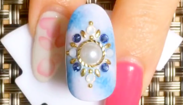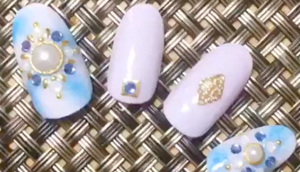 ストーンをのせることで、よりアラジンテイストに仕上げることができます。ブルーのポリッシュをのせた爪は、真ん中にパールをのせ、その周りを囲うように少し小さめのブルーやゴールドのストーンをのせましょう。他の爪はシンプルに真ん中にひとつちょこんとのせてくださいね♪