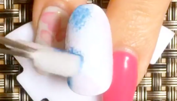 親指と薬指にはブルーをプラス。小さく切ったスポンジにブルーのポリッシュをとり、ピンセットでポンポンとのせましょう。アクセントが入ってとってもキュートですよね♡