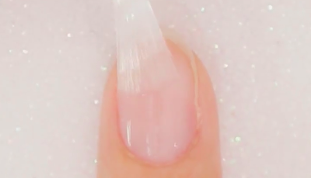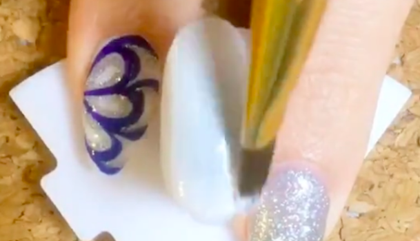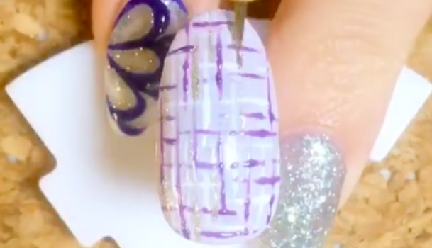 紫のポリッシュをぬった爪に細筆を使ってツイードをほどこしていきます。白のポリッシュで縦、横にラインを引きましょう。この時、ラインは最後まで描ききらず、途中で止めるのがポイントです◎
