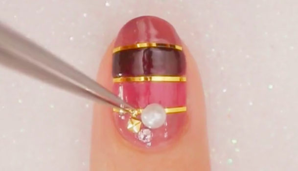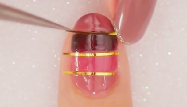 ボーダーラインの境目にゴールドのラインテープを貼ります。細かい作業になるので、先の細いピンセットがオススメです◎