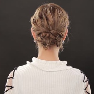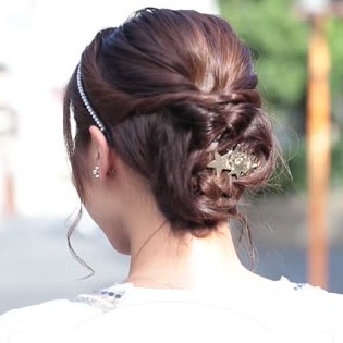 2.耳前の髪をねじって後ろに持っていき、お団子の下でピン留めする