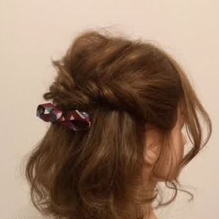 2.耳後ろの髪を両サイドからそれぞれねじり、ハーフアップの結び目が隠れるようにとめる