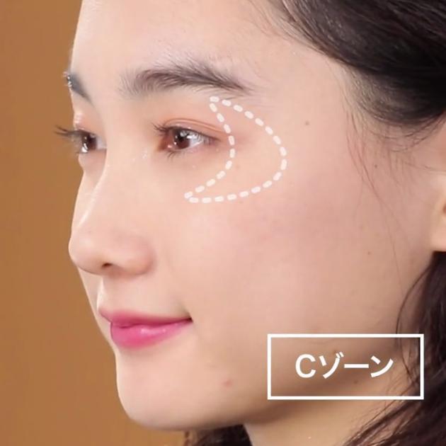 Cゾーンにハイライトをのせることで、目のくすみを飛ばし、目を大きく見せてくれます。横顔美人効果もありますよ。眉の下から頬の高い位置までCを描くようにひと塗りで伸ばしましょう!