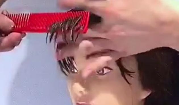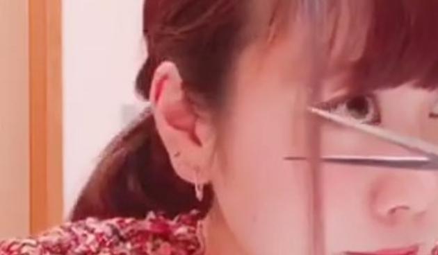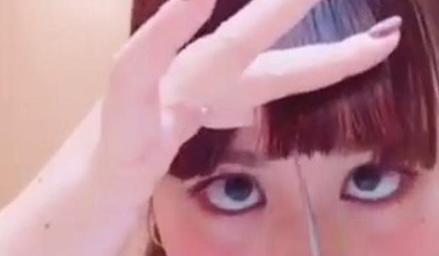 黒目の外側にある前髪と、前髪の端の部分を、目尻に向かって斜めに切っていきます。反対も同様にしてくださいね♪
