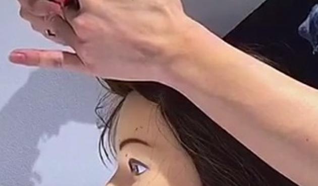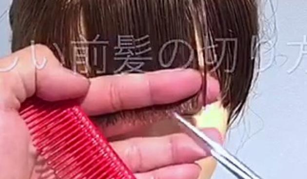 次は、切りたい長さより気持ち長めそろえて切ります。コツは、前髪は指ではさんで、はさみは横向きにいれること。