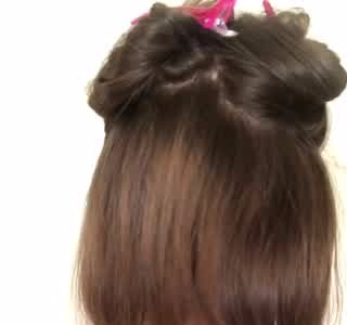 はじめに上と下で2段にブロッキングし、下の髪を外側にワンカールします。