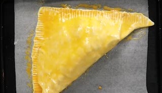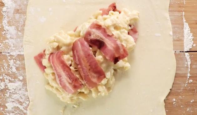 冷凍のパイ生地をしっかりと伸ばし、その上にベーコンをしき、先ほどの具をのせます。具をのせたら、パイ生地を三角に折りたたみフォークを使って口を閉じていきます。餃子のような形を意識するとGOOD!