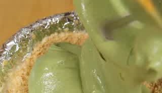 レアチーズケーキミックスと牛乳、抹茶シロップを混ぜ合わせ、先ほどしき詰めたクッキーの上に流し入れます。