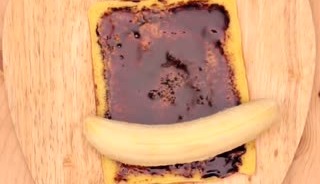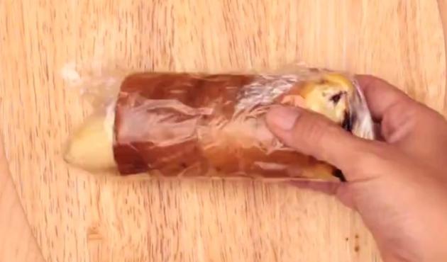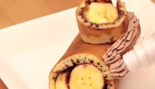 焼けた生地にチョコシロップを塗り、バナナに巻きつけていきます。
