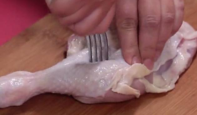 まずはもも肉をザクザクとフォークで刺していきます。この一手間が、お肉にしっかりと火を通し、身を柔らかくしてくれるんですよ♪