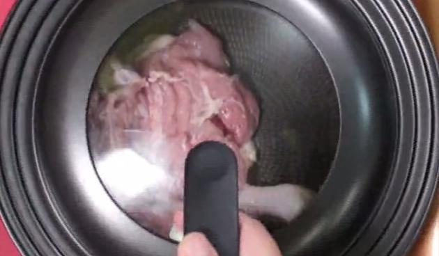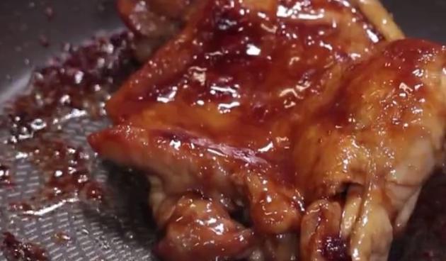 焦げ目がついたらもう一度裏返し、皮側を下にします。下にしたお肉にタレをかけ、絡めていきます。