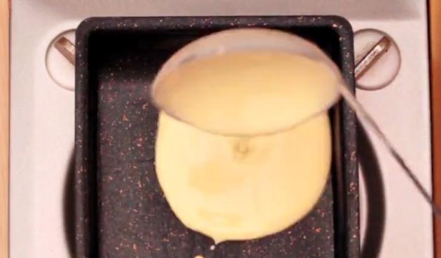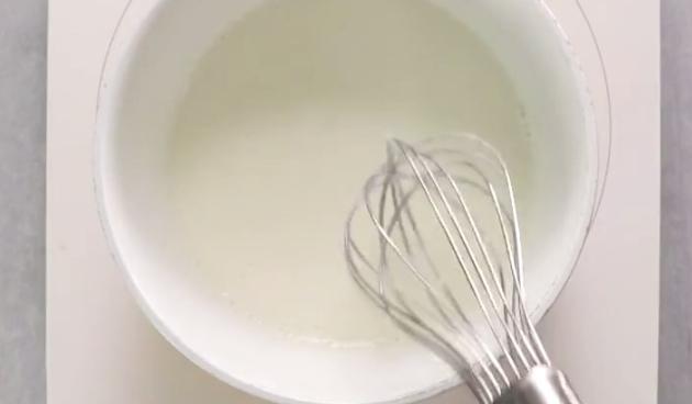 牛乳に薄力粉を入れ、加熱します。薄力粉は、しっかり、ふるいにかけながら入れてください。