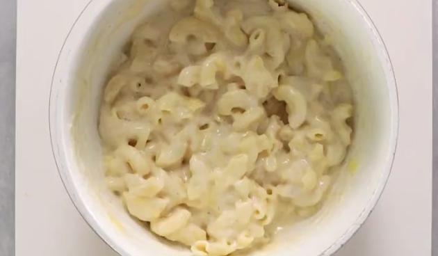 加熱した牛乳に、コンソメ、コショウ、茹でたマカロニ、チーズを加えて混ぜます。