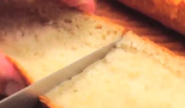 パンに縦に包丁を入れ、半分に切り開き、横に包丁を入れて好みの大きさにします。