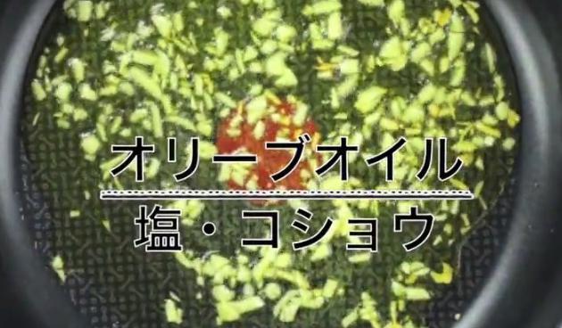 ニンニクをみじん切りにし、半量をオリーブオイル、塩、コショウで炒めガーリックオイルを作ります。