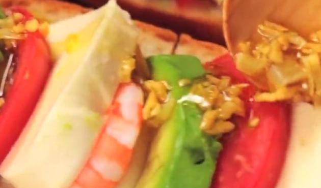 切った具材をパンの上にのせ、上からガーリックオイルをかけ、最後にニンニクのみじん切りをのせます。
