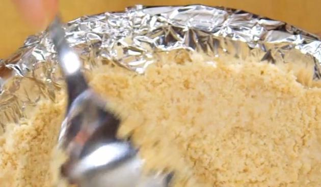 紙皿にアルミホイルをしき、クッキー生地をしき詰めます。