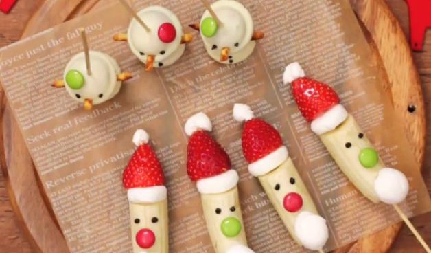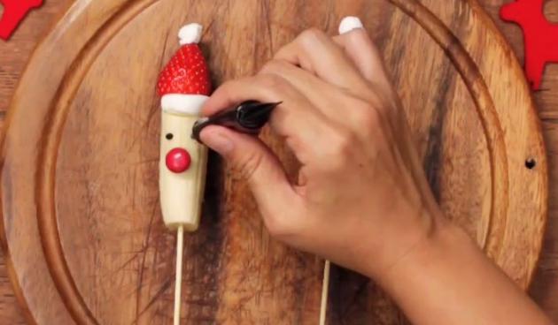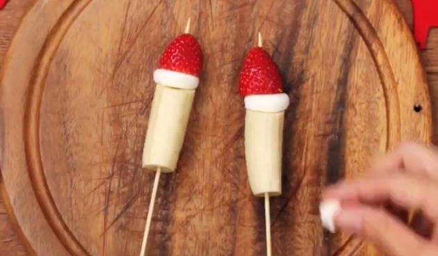 まずはサンタバナナの作り方からご説明します。竹串に、半分に切ったバナナを切り口が上になるように刺し、その上から切ったマシュマロ、いちごを順番に刺し入れます。