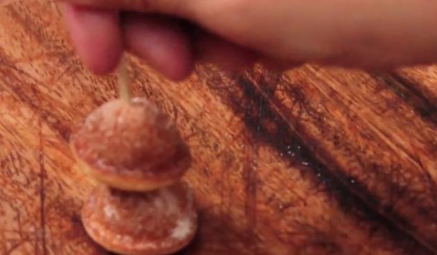 続いてはスノーマンカステラの作り方をご説明します。まずは、竹串に鈴カステラを2つ刺します。