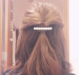 耳より上の部分で、髪をざっくり取ってルーズ感が出るようにハーフアップにします。結び目をくるりんぱすることで、こなれ度がグッとアップ!顔周りのサイドの髪は、あまりボリュームが出ないように巻いて、すっきり仕上げるのがポイントです。
