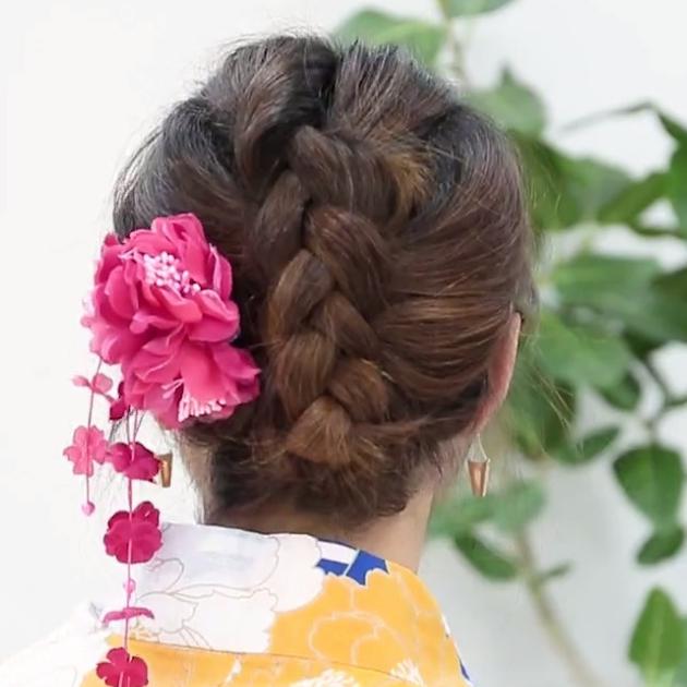 三つ編みやくるりんぱで作るまとめ髪。すっきりと清潔感もあり、さらにうなじも見えるから、浴衣にもピッタリなヘアスタイルですよ。