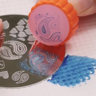 ネイルスタンププレートの好きな模様の上にマニキュアを塗ります。ムラが出ないように、付属のスクレイパーで余分なマニキュアを取り除くとキレイに色づきますよ◎